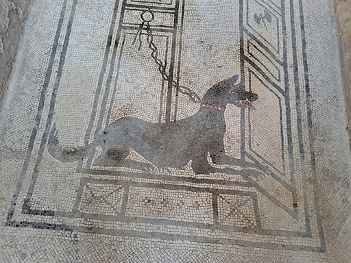 L’atrio è interamente ricoperto da un pregevole tappeto musivo a cassettoni con animali policromi allusivi alla prosperità e due ritratti, uno maschile l’altro femminile, recentemente restaurati.