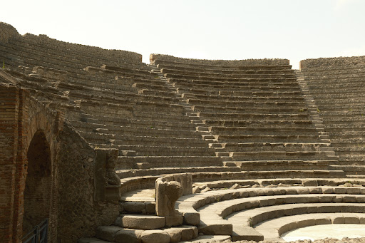Odeon or the Small Theater of Pompeii stands near the Bolshoi Theater. It was built in 80-75 years BC. In ancient times, the Odeon or the small theater was covered with a four-tiled roof. The theater follows the plan of other theaters built in the Roman Empire. At a time when the Bolshoi Theater was mainly used to stage drama, the Odeon was used to perform musical concerts. The purpose of the roof was probably to add to the acoustic effect. In the Odeon were two high seats for important guests or priests for conducting pagan cult rituals. These platforms are completely cut off from common places. They also had separate stairs to enter. The seats were made of brickwork with tuff plates. The Small Theater housed about 1500 spectators. The lower four rows were destined for the city's elite and separated from the upper 17 rows by a high parapet. From the parapet, only its left side remained (if viewed from the stage). The Small Theater was connected to the Bolshoi Theater by a...