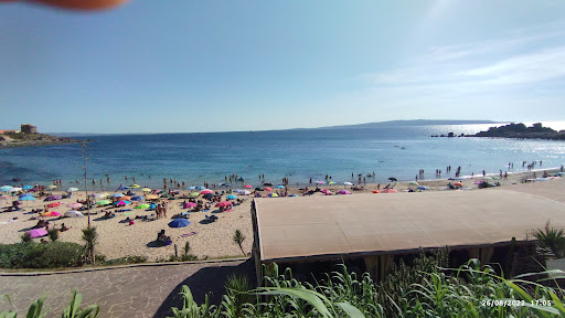 Not a bad beach the algea is a bit of a pain S the smell is horrendous, but but the beach is fine and convenient especially cor little.children, just a shame its si close to the port as some days the fumes from the dragetto and unloading ships but the views are great to see Carlo Forte and sant antiocco also the council are modernising the surrounding area and the road down to the beach finally, and a public pathway also, and amenities within 5 - 10 mins walk also , the algea part of the beach is an idea to extend the bea h ecologically so more space for people to come to the beach all in all for a small beach its not...