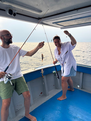 Day is split into fishing, snorkeling / bathing and lunch. Calling it lunch is the greatest understatement. They serve their own home made starters, local side dishes along with the fish cooked on the spot. Delicious.