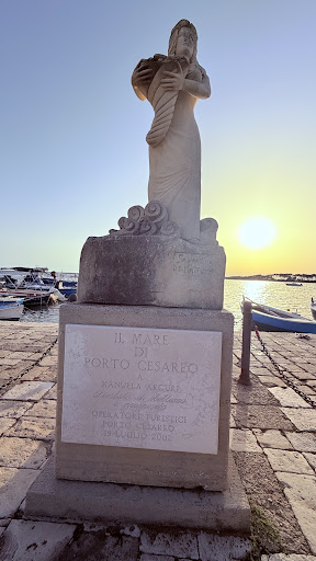 La statua famosa soprattutto per le polemiche a riguardo. Installata nel 2002 e dedicata a Manuela Arcuri, come simbolo di bellezza e prosperità, raffigura l'allora giovane ed emergente attrice (nota anche per numerosi calendari senza veli), nelle vesti della dea fortuna che porta nelle mani una cornucopia piena di pesci. Ma che bella sviolinata. Vabbè facciamo finta di crederci... La statua l'ho vista qualche anno dopo e non era un granché ma almeno allora era nuova, in buone condizioni e pulita; anche se ovviamente viene da chiedersi "Che cavolo c'entra Manuela Arcuri con Porto Cesareo?" Poi successivamente un'amministrazione comunale ha rimosso la statua e un altra l'ha rimessa in posizione. Nel frattempo la statua è invecchiata precocemente; il naso e le labbra sono state vandalizzate, la pietra si è fatta scura in più punti. La collocazione è abbastanza infelice: si trova sul molo di fronte ai tavolini di un vicino Bar. Però stranamente la statua guarda sempre verso terra. Il che per una statua posizionata sul lungomare è...