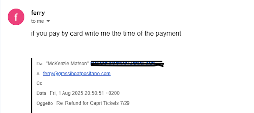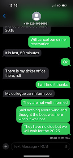 After review of the owner’s response, I want to clarify something as she suggests what I said was incorrect and that is not true. She did state the trip was canceled due to winds yet nobody was notified and it was not windy. Several other boats from other companies came and left with passengers. I did speak with the onsite representatives at the kiosk and I showed them the text where the customer service line said it was windy. They said no and giggled. They were honestly worthless and I felt they were just laughing at my situation. Yes, the customer service and the onsite representatives both suggested us to take the later ferry. We were not going to cancel as we had no place to stay in Salerno so why ask for a refund. The next ferry to note arrived 20 minutes late and took over an hour to arrive. Customer service said it would be fast and take 50 minutes. So we not only were not provided service as originally scheduled but did not arrive at our destination until 2.5 hours after we were supposed to. By that time we were tired from traveling since 9:30 am earlier in the day and had canceled dinner reservations. I find it very disrespectful and disappointing that the owner of this company has the first response to this issue that the customer is incorrect. I have posted the conversations to be fully...