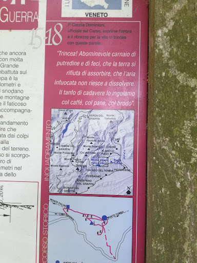 Read moreInteressante sito storico della Grande Guerra, poco conosciuto. Grazie ai volontari, le vecchie strutture di difesa militari sono state recuperare e rese visitabili. Il posto si raggiunge preferibilmente dopo una adeguata escursione lungo le trincee del Monte Tomba, che rendono più comprensibile la situazione storica di quel periodo. Ottima anche la visione del panorama, che domina la pianura fino alla laguna di Venezia. Il tutto, a pochi chilometri...