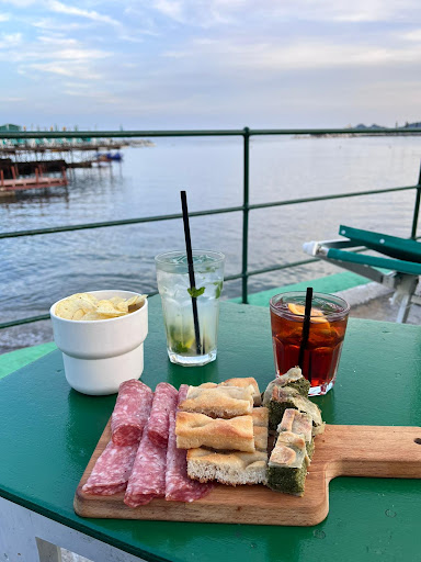 Decidiamo, verso le 18, di andare al bar per bere qualcosa. Fila per il bar decisamente non da ferragosto, ma da giorno feriale normale. Attesa abbastanza lunga per un servizio molto discutibile a partire dalla barista con uno scazzo palpabile. Io personalmente ho deciso di bere uno spritz: rigorosamente fatto a occhio, con metà parte di Aperol e metà parte di vino bianco fermo. Il tutto per 8€. Credo comunque di essere stato fortunato, vista la complessità degli altri drink, ad aver scelto questo, almeno non ho avuto bruciori di stomaco per tutta la sera, ma ovviamente resta non bevibile e, soprattutto, non spritz.