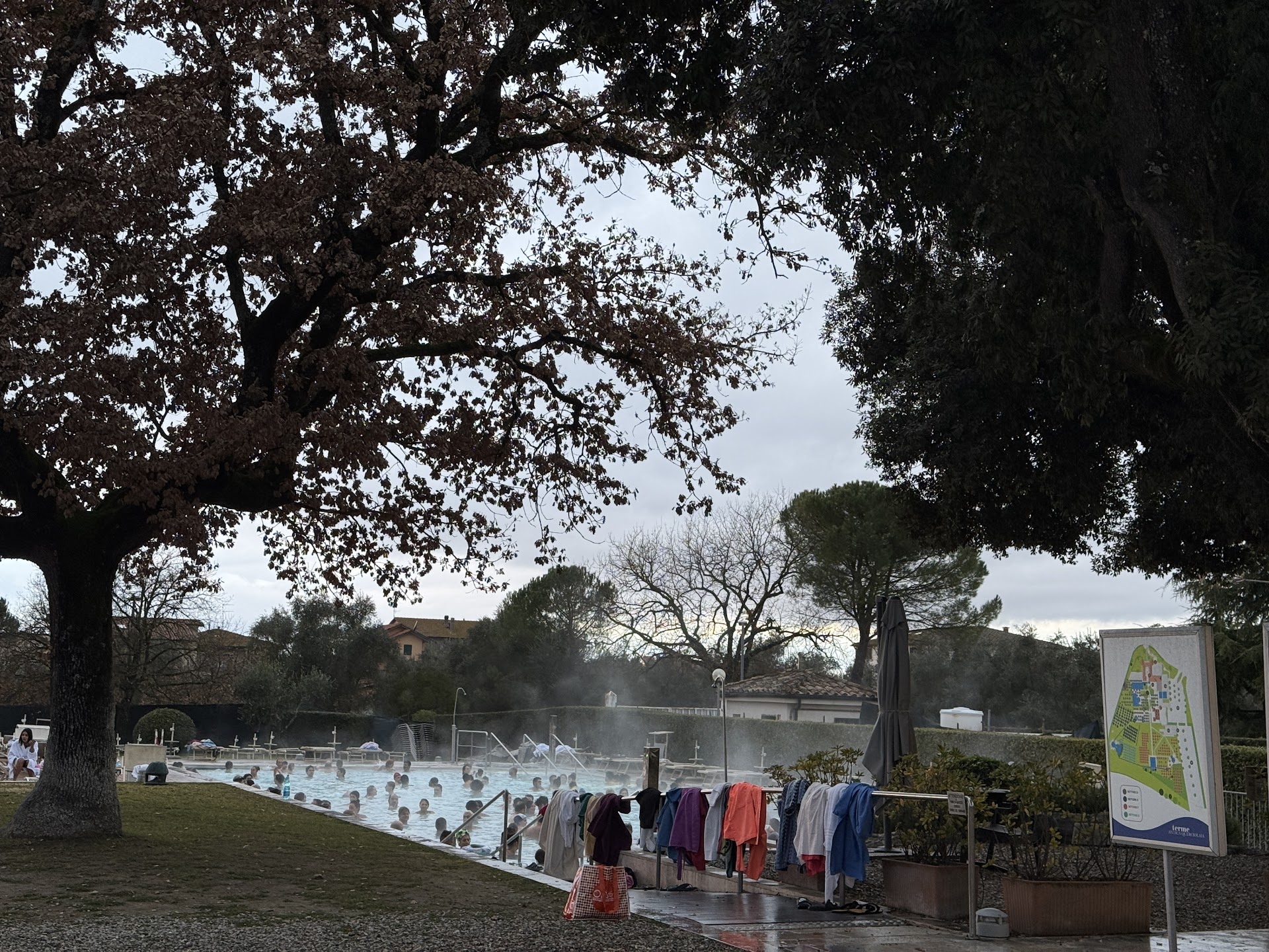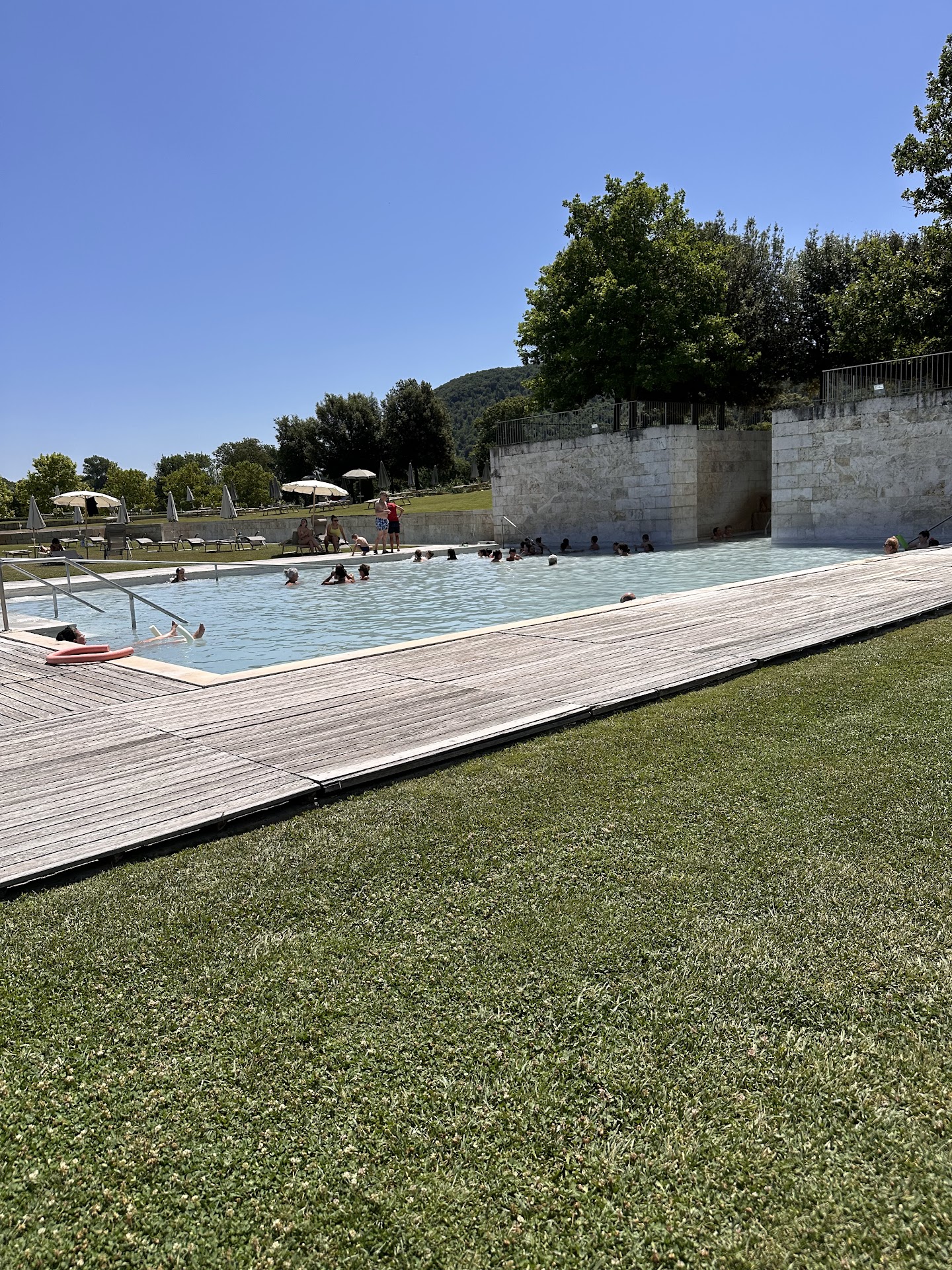 A great relaxing day out. Lots of loungers in the gardens (with some trees for shade - it was 38C the day we went so welcome) and surprisingly uncrowded so lots of space. The pools vary in temperature and quite large for hot pools so no wait for the one hot one. The water is a bit cloudy due to the minerals in it and has the classic sulphur egg smell but not off putting at all. The place is nicely built in stone. Facilities were good, changing tools, toilets, showers and all really clean plus a bar and basic food - but fine to bring your own sandwiches and drinks (we did). Don’t expect a hotel spa experience, it’s much more a really nice swimming pool complex and good for families. Rest of customers seemed to be some families (this is late July), some couples and lots of older people, almost all Italian. Recommend as a ‘down day’ between hill town...