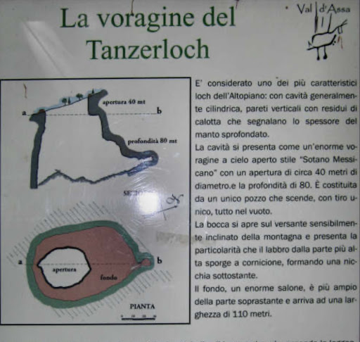 Tanzerloch is a karstic depression 80 meters deep and about 30 meters wide. Short hike from Comorovere (church steeple of town...