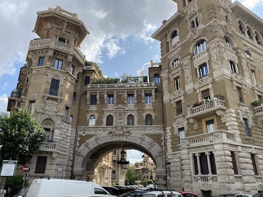 Read moreUn magico portale per un magico mondo... potrebbe essere l'incipit per l'avvio di una visita in un pezzo di Roma che è sempre stato ricondotto all'esoterismo, così lo immaginavo quando l'ho aggiunto su Maps. Ma in realtà è proprio così, non è un semplice portone e meno che mai un curioso arco... è proprio un'opera d'arte ricchissima di particolari e di suggestioni. Di fronte, dominato dal mascherone che sembra sorreggere lo splendido lampadario in ferro battuto che pende all'interno, ha una struttura austera, sormontato da due ordini di collegamento tra i due palazzi degli ambasciatori e ricoperto da una invidiabile terrazza giardino. Completamente decorato al suo interno con elementi asimmetrici gode di due terrazzi ai lati dai quali si affacciano gli alloggi destinati ai custodi (pare per movimentare il lampadario a candele) ed è presente anche una dedica a Coppedé. Peccato per il colore del recente restauro (rosso) rispetto a quello precedente ma forse non originale (ocra). Guardate le foto e i video che ho postato e le altre recensioni su Roma e le sue meraviglie che ho fatto e se sono stato utile cliccate su utile e se...