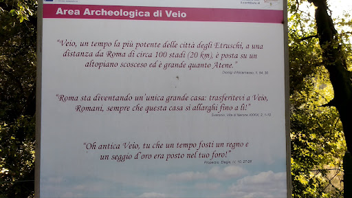 L’antica città etrusca di Veio sorgeva su un altopiano di forma triangolare, cui si raccordava nel lato sull’acropoli di Piazza d’Armi, lambito da due fiumi, il Fosso della Mola e il Cremera, affluente del Tevere. Nuclei abitativi costituiti da capanne sono presenti sul pianoro già nell’età del Bronzo e in epoca villanoviana (inizi IX secolo a.C.). In seguito al crescente sviluppo economico, dovuto al controllo del basso corso del Tevere e allo sfruttamento delle saline sulla riva destra del fiume, come testimoniato dai ritrovamenti di ceramiche di importazione greche, che documentano anche gli intensi traffici di Veio con i commercianti greci, la città si trasforma da un abitato di capanne a un centro urbano con una cinta muraria costituita da blocchi di tufo e un poderoso aggere (bastione di terra con fossato antistante) e con case costruite in muratura (VII-VI secolo a.C.). La vicinanza con Roma (appena 17 chilometri) portò Veio ad un inevitabile scontro per il controllo del territorio, concluso con la conquista definitiva della città da parte di Furio Camillo nel 396 a.C. Il territorio fu quindi annesso allo stato romano, ed organizzato con una serie di piccole fattorie e ville rustiche. Dopo un periodo di abbandono, sotto Cesare fu creata una colonia, trasformata da Augusto in municipio con imponenti edifici. In seguito però il territorio veiente fu nuovamente abbandonato, forse già dal II secolo d.C., fino all’epoca medievale, quando nascerà il borgo di Isola Farnese. Intorno alla città si trovano numerose necropoli, con tombe a tumulo e a camera che hanno restituito importanti corredi funerari; tra queste vanno ricordate la tomba delle Anatre, che costituisce la più antica tomba etrusca con pitture parietali (secondo quarto VII secolo a.C.) e la tomba Campana (fine VII secolo a.C.), decorata con animali e motivi vegetali e con figure di cavalieri accompagnati da personaggi a piedi o animali fantastici.