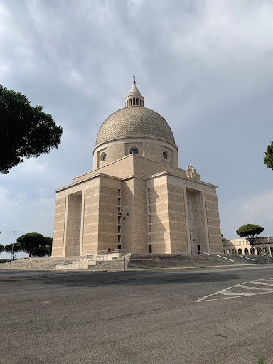 La Basilica (titolo acquisito nel 1967) fu progettata verso la fine degli anni trenta nell’ambito del progetto E42, ma i lavori terminarono alla metà degli anni cinquanta, infatti l’inaugurazione dell’edificio Sacro al culto avvenne il 3 luglio del 1955, si trova in una posizione scenografica sopra una collina e per raggiungerla da Viale Europa, si deve percorrere una bella scalea monumentale, con ai lati delle siepi molto curate e al tramonto si assiste ad uno spettacolo policromo pittoresco.
