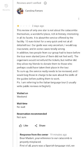 RECENSIONE ORIGINALE “This review of only one star is not about the catacombs themselves, a wonderful place, rich in history, interesting in all its facets. It is about the service offered by the facility. 10 euro ticket for a very quick and not at all detailed tour. Our guide was very uncertain, I would say inaccurate, and in some cases totally wrong. In addition, two people from our group had to leave before the tour even started (one of them did not feel well). The organisers would not refund the tickets, but neither did they allow my friends to donate them to those who perhaps could have taken their place in the tour. To sum up, the service really needs to be reviewed, and I would beg those in charge to be sure about the skills of the guides before putting them to work. P.s. I am referring to the Italian language tour (I usually write public reviews...