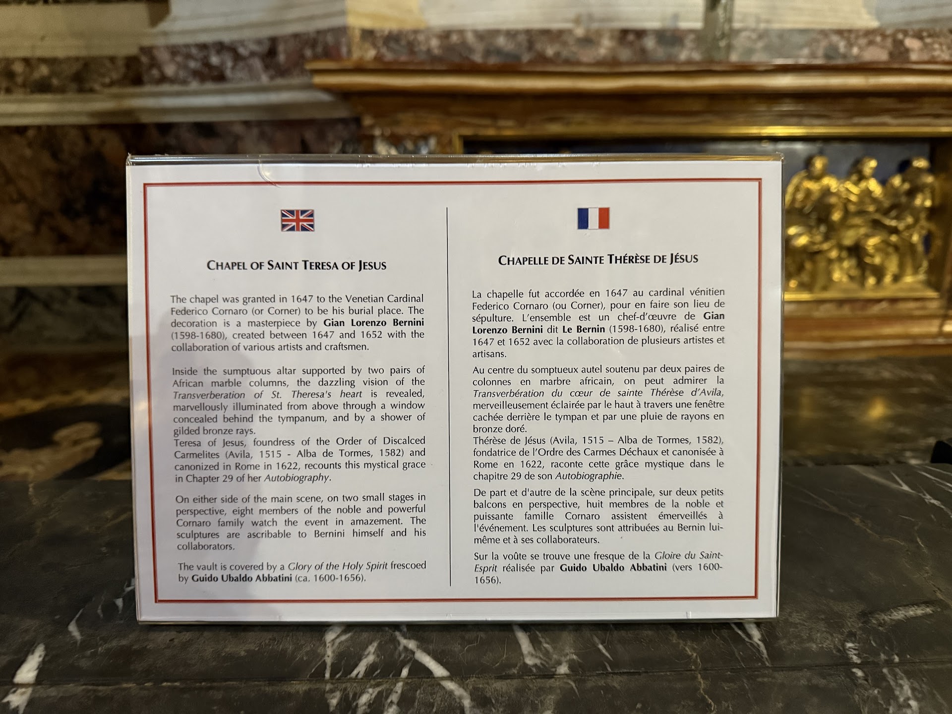 Santa Maria della Vittoria is a Baroque jewel tucked away in the heart of Rome, a place where history, faith, and artistic genius converge. From the moment you stand before its stately facade, designed in the early 17th century by Carlo Maderno and completed under Giovanni Battista Soria, you’re struck by the grandeur of the Roman Catholic tradition at its peak. The facade, adorned with intricate carvings and papal crests, invites you to climb its steps and enter a sanctuary that feels both intimate and monumental. Inside, the church is nothing short of breathtaking. It is most famous for housing Bernini’s Ecstasy of Saint Teresa, a masterpiece that brings marble to life with such sensuality and spiritual intensity that it has inspired awe and debate for centuries. Bernini captures a moment of divine rapture with such dramatic flair that even art critics like Irving Lavin and Simon Schama have written extensively on its blend of theatricality and devotion. Beyond Bernini’s work, the church is filled with treasures: vivid frescoes by Giovanni Domenico Cerrini and gilded stucco decorations that immerse visitors in the heavenly opulence of the Baroque era. Each corner seems to tell a story—of devotion, artistic rivalry, and the Catholic Church’s powerful role in shaping the cultural identity of Rome. What makes this church particularly moving is its size. Unlike the grand basilicas of Rome, Santa Maria della Vittoria feels accessible, almost like stepping into a perfectly curated art gallery of the 1600s. Yet, the energy here is undeniably spiritual—one can sit quietly and lose themselves in the interplay of light, color, and stone. Gian Lorenzo Bernini’s masterpiece, The Ecstasy of Saint Teresa, encapsulates the Baroque era’s grandeur and emotional intensity, showcased in its home within the Cornaro Chapel of Santa Maria della Vittoria in Rome. This sculptural ensemble not only serves as a pinnacle of Bernini’s technical mastery but also as a profound spiritual meditation. The central composition features Saint Teresa of Avila in a moment of divine rapture, as described in her own writings. Bernini’s ability to translate her mystical experience into marble is awe-inspiring. The saint’s languid, almost ethereal posture contrasts with the dynamic folds of her habit, which ripple like waves of spiritual ecstasy. The angel, poised delicately above her, holds an arrow with an expression that seamlessly combines tenderness and divine authority. The golden rays cascading from the concealed window above simulate a divine light, creating an interplay of the material and the immaterial. This architectural framing magnifies the transcendent nature of the experience, as if heaven itself breaks into the space of the chapel. The surrounding marble, with its rich tones and textures, further elevates the sense of opulence and devotion. Below, the Cornaro family is depicted in relief, observing the celestial scene from balconies, drawing the viewer into the narrative as witnesses to this mystical event. This ingenious integration of sculpture, architecture, and light exemplifies Bernini’s genius, offering not just an artwork but a theatrical and spiritual experience. The nearby depiction of the Last Supper in gilded relief complements this theme of divine mystery, reinforcing the profound connection between human experience and the sacred. Bernini’s work invites reflection on the nature of divine love and the human capacity for transcendence, making it a timeless masterpiece that continues to inspire awe...