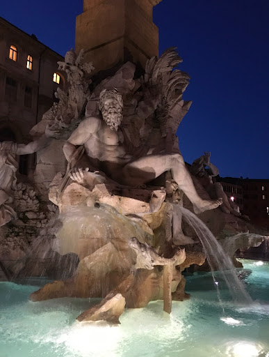 Design and Symbolism: • The fountain represents the four great rivers of the known continents during the 17th century, symbolizing the global reach of the Catholic Church. • Each river is personified by a monumental figure and is surrounded by animals and flora native to its region: • Danube (Europe): Represents the closest river to Rome; depicted as touching the papal coat of arms. • Nile (Africa): Shown with a veiled head, symbolizing the river’s mysterious source. • Ganges (Asia): Represented with a long oar, signifying the river’s navigability. • Rio de la Plata (America): Portrayed in a dramatic pose, startled by a snake, symbolizing the New World’s untamed nature and riches.