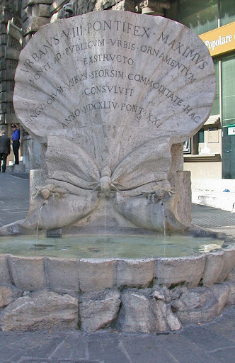 When it was decided to reconstruct around 1915, the original parts were mostly lost so a reconstruction was made and placed where you find it today. Only a few parts of the original seem to be included in this fountain but the design seems to be Bernini's original. You will see an open shell with the signature Three Bees, the signature of the Barberini Family Coat of Arms. From the bees pours three small streams of water into the small ground...