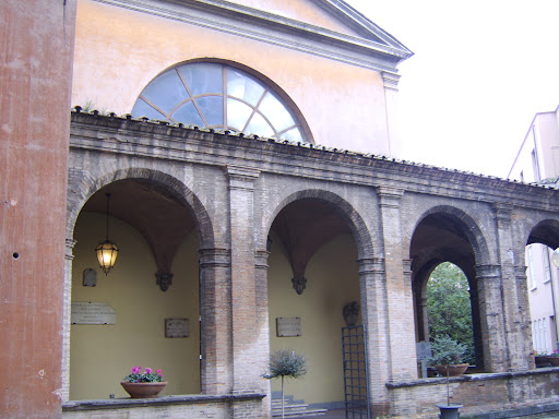 Parzialmente ho potuto apprezzare la facciata con un portico, al cui interno sulla destra è posto in alto lo stemma di Pio IX, con una lastra marmorea che ne ricorda il restauro del 1787, al centro un grosso mortaio in marmo con ai lati due suggestive statue di angeli.