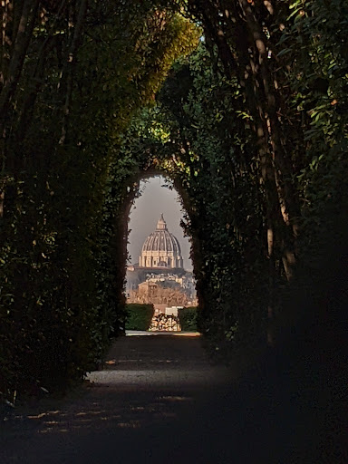 We went on a quiet Thursday morning, and the line wasn't too bad, maybe 15 minutes. I actually waited in line twice. The funny thing is, I got the shot with my phone, but I couldn't get it with my $5,000 camera. Oh well, it was worth it to try. But here's an insider tip: as you walk back towards the Circus Maximus, there's a lovely city park behind a wall. You'll know it by the orange trees (see screenshot). It has the same view of St. Peter's Basilica as the keyhole, only without the keyhole. So if you can't get a good shot from the keyhole, just go to the park, and you'll have a nice...