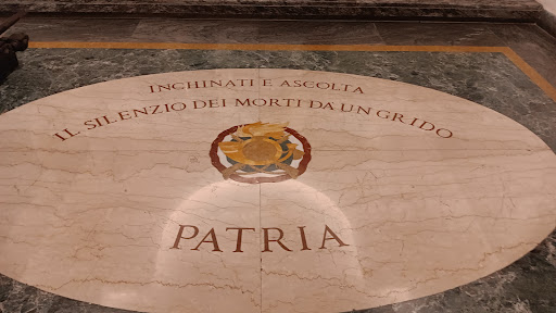 • Al piano terra una grande sala dove si trova fra tanti cimeli, procedendo oltre si accede al Sacrario dove vi sono splendide vetrate policrome progettate dallo scultore romano Publio Morbiducci (1889 – 1963), sul pavimento si trova una scritta molto evocativa: INCHINATI E ASCOLTA / IL SILENZIO DEI MORTI DA’ UN GRIDO / PATRIA