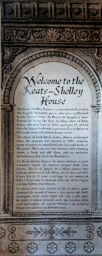 "L'’esterno dell’edificio è simile a com’era quando Keats arrivò a Roma nel vano tentativo di rallentare le ineluttabili conseguenze della tubercolosi. Aperta al pubblico nel 1909, questa casa museo contiene una ricca collezione di quadri, sculture, manoscritti, oggetti e prime edizioni delle opere di Keats, Percy Bysshe Shelley e Lord Byron, ovvero i più importanti esponenti della seconda generazione romantica inglese.