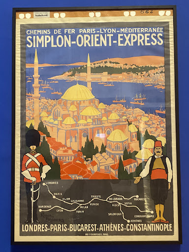 Orient Express exhibition at the Villa Médicis Académie de France is an exhibition that I was counting the days for. I went there on the opening day, March 17, 2023. Villa Médicis is situated at the top of the Spanish steps. When one walks up the steps at Piazza di Spagna, it is down the street, on the left. The exhibition is curated by Eva Gravayat and Arthur Mettetal, and co-produced by the Fonds de notation Orient Express and the Recontres d’Arles festival. The train Orient Express was a railway company: the Compagnie internationale des wagons-lits (CIWL). The CIWL railway company linked the East to the West and the destination was Constantinople (modern day Istanbul), which was the capital of the Ottoman Empire. The orient Express train was a global “cultural icon.” This exhibition shows the importance of the Orient Express, that it was the first luxury train. The exhibition also has important details about the production of the train. There are blueprints, photos, the information on the warehouse where the train was built. There are maps, the train’s routes, marketing posters, advertisement photos, and photo of the tourism agency that booked the train tickets. There is a section on Agatha Christie’s book, Murder on the Orient Express, and the movie adaptation of the book, “Murder on the Orient Express,” had posters of the film. There are also additional photos of the actors on the Orient Express train. What an incredible journey it must have been for the railway company! They started with an idea of a luxurious train; they created its plans and made an idea reality, not knowing its journeys from West to East and East to West would inspire stories for literature and movies. All parts of the exhibition was very interesting. As example, there is a photo of the “Agence de voyages Wagon- Lits, 3 place de l’Opera a Paris,” from 1886. It is a photo of the curve of a building, at the street corner, with a long and narrow white poster. It writes, “THE INTERNATIONAL SLEEPING CAR” and “EUROPEAN EXPRESS TRAIN COMPANY.” The street lamp in the photo reminds one of Haussmann, remodeling Paris in the 19th century, and adding street lights. There is a crowd in front of this building probably waiting for the agency to open it’s door for ticket sales. There is a horse carriage strolling by the agency, between two street lights on the street. Another favorite was the1930 poster of Simplon- Orient Express (chemins de for Paris - Lyon- Mediterranée), by Roger Borders. The poster has a large orange mosque. There is a body of blue water of Bosphorus, and many small and big ships. There is a large patch of green behind the waterside palaces and homes. The writing on the blue sky of the poster says “CHEMINS DE FER PARIS-LYON - MEDITERRANÉE.” Underneath that, it says “SIMPLION -ORIENT-EXPRESS.” The orange color dominates the overall tone of the poster, which makes it appear as if there is sunset. At the bottom of the poster one can see the the routes of the Orient Express. There is one route from London and another from Paris. They meet or connect at Milan. From here they continue in one line to Belgrade and divide to three different routes: Bucharest, Athens, and Constantinople (Istanbul), which is the final destination. There are two figures on the route map. The man on the left is in his official red British guard uniform, and a black furry hat. His left index finger points at London, the start of the route. The man on the right is in his all casual Ottoman garments: white long sleeved shirt, a black sleeveless vest, and another yellow orange shirt under his white shirt; he has a red wide belt on his belly, with a red fez on his head. He points at the route with his right hand, palm outwards, appears as a welcome gesture.