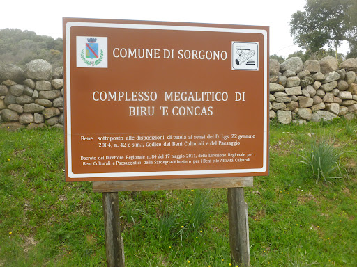 Il sito è ubicato in territorio di Sorgono in località Coa ‘e sa Mandara, immerso tra i folti boschi di sughero e lecci su una collina di 559 m.s.l.m. Biru ‘e concas significa letteralmente “Sentiero delle teste” e la denominazione è dovuta alla presenza di circa 200 menhir, grossi massi di granito locale scolpiti e levigati ritrovati all’inizio del XX° secolo concentrati tutti in circa cinque ettari di terreno. Le prime notizie risalgono al 1990 quando vennero individuati i primi 30 menhir; successivamente nel 1994 iniziarono i lavori diretti dall’archeologa M. Ausilia Fadda che videro l’innalzamento in sito di una parte di essi in due lineamenti. Alcuni menhir presenti il loco sono risultati essere più arcaici rispetto ad altri (risalenti al Neolitico recente 2700-1700 a.C.) e vengono detti proto-antropomorfi, poiché lavorati nel tentativo di ricreare un volto umano stilizzato con tanto di naso e occhi (ne è di esempio un menhir adagiato a terra), oppure come testimonia una statua menhir in 7° posizione nel secondo allineamento, un volto e un pugnale in vita. Il Comune di Sorgono decise così nel 2004 di acquistare i terreni per valorizzare il sito e nel 2006 il Ministero della Cultura stanziò i fondi per dare vita ad un vero e proprio parco caratterizzato da tre diversi sentieri più cartellonistica: sentiero archeologico, naturalistico e sentiero paesaggistico. A seguito di ciò, tra il 2010 e il 2011vennero effettuati nuovi lavori di scavo e vennero individuati molti altri menhir (che non è però stato possibile re-innalzare) più una struttura muraria megalitica a doppio paramento lunga circa 160 mt, con porta d’accesso rettangolare rivolta ad est, risalente alla fase della cultura di Monte Claro, nel pieno periodo Eneolitico (2400-2100 a.C.). Nella zona più bassa della collina fu individuato un villaggio composto da capanne circolari che ha restituito notevoli quantità di frammenti ceramici, punte di freccia di ossidiana e selce. Lo studio di ciò che è rimasto dei reperti ha permesso di datare il sito con sicurezza tra il Neolitico Recente e l’Eneolitico (IV-III millennio a.C.) e si è pensato che la presenza di grandi quantità di frammenti sia dovuta all’esito della battaglia del 6° sec. ordinata da Papa Magno Gregorio contro gli idoli Barbaricini nell’intento di cristianizzare l’isola. Nel sito è presente una sorgente ubicata all’inizio del sentiero archeologico, massi con coppelle risalenti alle ultime fasi del neolitico e inizio dell’età del Rame, due nuraghi (uno a corridoio, denominato Biru ‘e Concas risalente al Bronzo recente e il maestoso proto-nuraghe Talei, risalente all’età del Bronzo Medio) più i ruderi di una tomba dei giganti e di un dolmen. La grande concentrazione di opere all’interno del sito fa pensare che il complesso megalitico fosse un ricco centro di incontri e scambi.