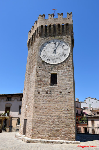 Nel 1145, su gentile concessione del Vescovo Liberto di Fermo, fu costruita questa Torre di guardia a protezione della Valle del Tronto e a completamento del castello (ormai solo rudere) del quale era il Mastio. Di base esagonale, per permettere una migliore difesa e un maggior numero di uomini sugli spalti, è alta una ventina di metri e permette allo sguardo di spaziare su un ampia fetta di territorio sottostante. Restaurata una prima volta nel 1901 dall'architetto Sacconi e nel 2001 dalla Lunerti, ad oggi dovrebbe essere agibile...solo che pare quasi impossibile trovare orario e addetti per la visita. Del 1700 l'orologio, recuperato e posizionato dai lavori di ampliamento della Chiesa di San Benedetto Martire, mentre del 1800 circa sono le due campane collegate con il meccanismo dell'orologio a scandire il tempo. Centralità del paese "alto", luogo di frescura estiva e circondata dalle antiche abitazioni, è spesso utilizzata quale sede di mostre o di concerti o più modestamente come ritrovo dei paesani per una chiacchiera in attesa...