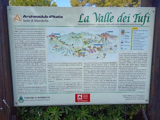 Valle dei Tufi. Tra Mondolfo, San Costanzo e Stacciola c'è una piccola valle nascosta dove la natura regna sovrana, la Valle dei Tufi. L'ambiente è campestre caratterizzato da strade, pareti e grotte di tufo, dove è bello camminare tranquillamente, ammirando questo paradiso naturale. Una rete di stradine in tufo collega tutti i punti caratteristici di questo luogo: si parte dal Santuario Madonna delle Grotte, si passa per il Lago della Grottaccia, per incontrare poi grotte scavate nel tufo, incisioni rupestri,...
