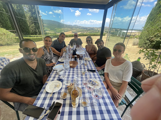 We visited this winery on the last day of our Tuscany trip and it immediately became one of the highlights of the entire trip. Arranging an appointment was straightforward and easy. When we arrived at the top of the winery after a somewhat adventurous road, we had a wonderful view of a dreamlike Tuscan landscape and the wonderful San Gimignano, as well as the typical Tuscan buildings of the winery. We were in a bit of a hurry when we got upstairs, but if you first breathe in the wonderfully calm atmosphere of this idyll, you come to rest immediately, but at the latest when you get to know David with his calm, level-headed and serene manner. After some small talk, the tour started. First about the history of the winery on the grapevines, about the production in the warehouses and about the wine itself in the wine cellar. David's knowledge does not begin and end with wine, he has a great general knowledge, which enables him to consider many aspects of wine production and sales from different perspectives and contexts and what makes the tour all the more informative for visitors. After this very informative tour in an intimate circle, we went back to the table where, in addition to some bread with olive oil and nice conversations, the wine tasting took place. David takes his time and goes into every single wine and he and Salomon are great company. I would just like to say this much about the wines: our wallets are now lighter and our cellars are full. In the end, David again showed us his hospitality and we were allowed to enjoy the food we had brought with us on his dreamlike terrace, together with a couple of open bottles of wine and an incredible view of San Gimignano and the surrounding landscape.