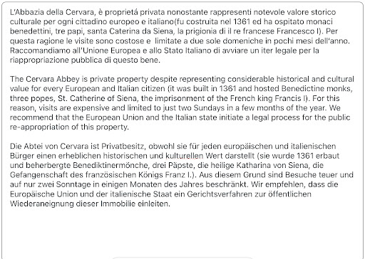 The Cervara Abbey is private property despite representing considerable historical and cultural value for every European and Italian citizen (it was built in 1361 and hosted Benedictine monks, three popes, St. Catherine of Siena, the imprisonment of the French king Francis I). For this reason, visits are expensive and limited to just two Sundays in a few months of the year. We recommend that the European Union and the Italian state initiate a legal process for the public re-appropriation of this property.