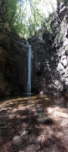 This is a nature trail that's shaded the entire way, with several spots along the stream where you can wade in the water. There’s a place to park at the start of the trail, right off the road ans some picnic tables along the stream. The walk begins with a steep downhill (and a steep climb back up), but it's fairly short (just a few minutes) and kids can manage it without any real difficulty. You’ll reach a fork in the trail: Right leads to the large waterfall — about 20 minutes of easy walking, with bridges crossing the stream. Left leads to the small waterfall — also about 20 minutes of relaxed walking, ending with bridges and a short crawling section! The trail is short overall, and the children...