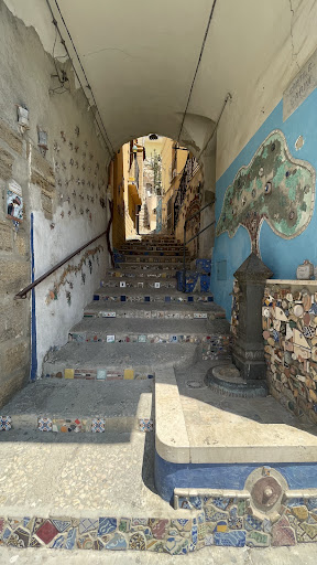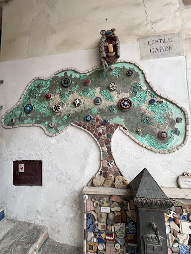 Ein schmaler Durchgang verwandelt sich hier in eine magische Welt: Wände und Treppen sind liebevoll mit Mosaiken aus Keramikscherben, GlasstĂźcken, Muscheln und gefundenen Materialien gestaltet â ein kolossales Recycling-Kunstwerk des lokalen KĂźnstlers Giulio Lorubbio (alias Lulo) ďżź. Der Hof wirkt wie ein offenes Freilichtmuseum, das sowohl Ăźberrascht als auch zum Schmunzeln bringt .