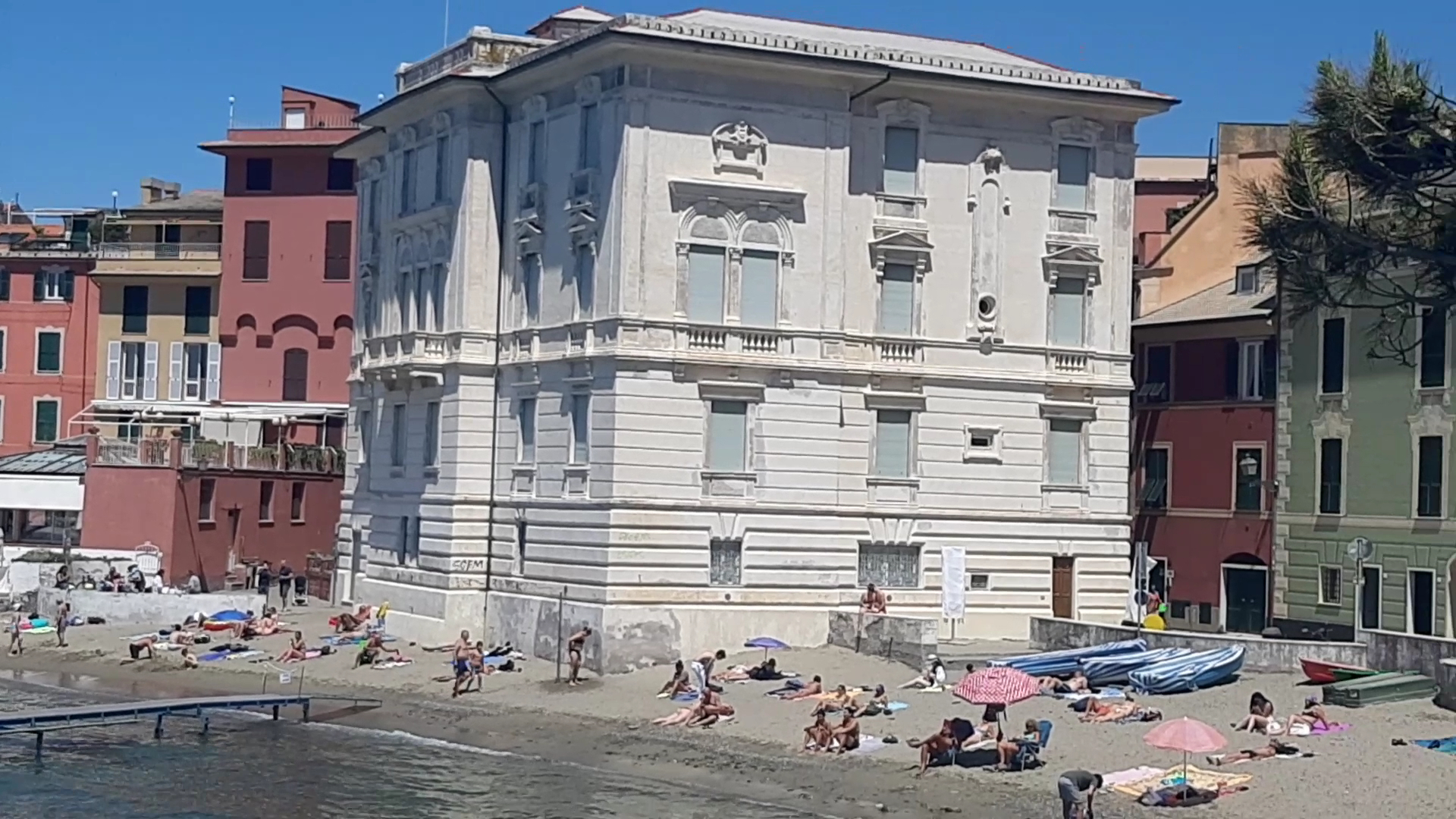 Thin (10-20 metres in depth to surrounding buildings) & long crescent beach, popular with locals and visitors alike, some businesses have their own parasols and lounge chairs, other is public. Main thing to note is look for the bagnino or lifeguard station, if you put up anything that blocks the view, on the sand, he/she'll be a pain in the backside. To the left of the bay, there are rock enclaves that can be reached by road and the steps down from the leftmost hotel (I forget the name). The water was clearer here when we stayed, in August 2018, with fishes and crabs and sealife not visible further across. The boat and kayak hire business, divides the bay, so you can't easily swim across without some risk. Good for couples with a parasol and beach mats, day out for young families exploring the rocks (with water shoes, Keen's, Crocs, etc., thong sandals/flip flops will be dangerous), teenagers being moody and sunbathing/gossiping/sneaking a blunt. Might come again, prefer the main...