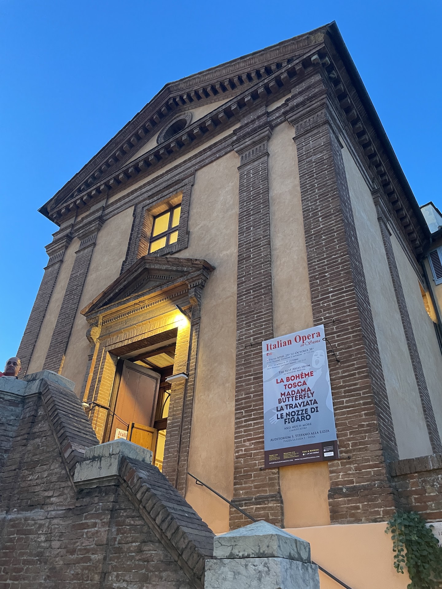Esperienza davvero eccezionale per gli amanti dell'opera. Bellissima atmosfera ascoltare le arie più famose di opere liriche all'interno di una chiesa ,in un'atmosfera davvero coinvolgente. Gli spettacoli si svolgono nella Chiesa di Santo Stefano a Siena riadattata ad auditorium per concerti il martedì il giovedì il sabato fino al 30 ottobre