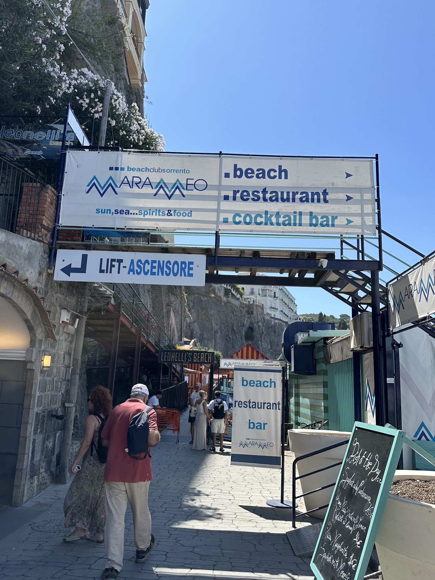 Itโs a struggle getting to the lift, from the railway station, pulling your 23 kg suitcase across the cobbles and flagstones while you read your GoggleMaps app to make sure youโre on track. No signs, mind you not everybody in Sorrento wants to go to this lift, and there are too many other signs cluttering up the views. No one collecting money at the top booth, but they were on the bottom exit way/ tunnel. When we got to the bottom (and had to get to Pier/ Wharf 5) there was more hard work going up and down temporary planking โฆ for upgrading construction work, I guess. My photo shows the view from Pier 5 looking towards the lift in the distance. You can see the height of the cliff, so imagine lugging your...