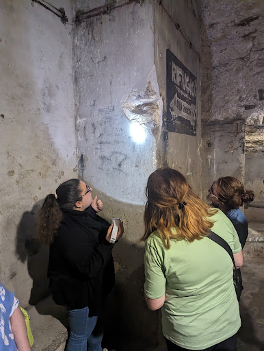 The staircase leads down three flights of stairs to the spring at the very bottom. It covers different periods of history from aquadect fresh water usage, the fraternity's burial grounds to WWII air raid shelter. It's guided by local enthusiasts, but not necessarily historical experts.