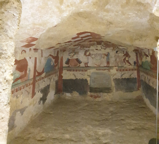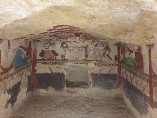Read moreScoperta nel 1874 questa tomba risale all'ultimo quarto del VI secolo a.C. ed è considerato uno dei più evidenti esempi dell'influenza dell'arte ionica per la sua marcata policromia, ma anche per il suo stile e per l'elevato livello qualitativo. Il nome le proviene dalle due leonesse poste una di fronte all'altra dipinte nel frontone della parete di fondo sulla quale è poi rappresentata la scena principale dell'ipogeo: due suonatori, uno di cetra e l'altro di doppio flauto guidano la danza di una donna da sola, vestita con lunga tunica a fiorellini ed un ampio mantello, e di una coppia, lei giovane e bruna con indosso una veste piuttosto trasparente e lui nudo e biondo con in mano un olpe, indubbiamente colmo di vino, premessa di una danza orgiastica. Sulle pareti laterali appaiono figure maschili, cinte di corone e sdraiate su cuscini. E' una delle...