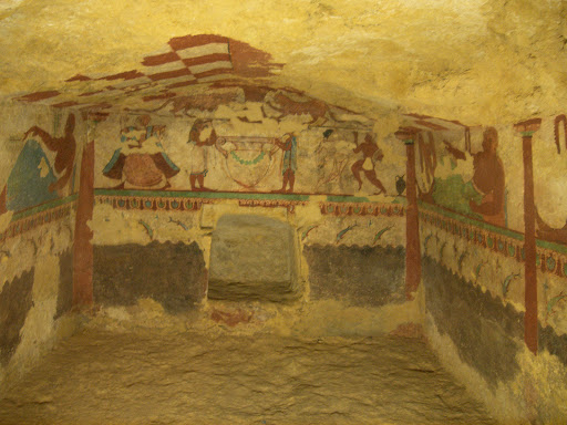 ENGLISH: Consisting of a single room with a gabled ceiling and access consisting of dromos with steps. Decoration: the ceiling is decorated with a checkerboard pattern and the walls are punctuated by six columns which give the tomb the character of a pavilion. On the pediment of the back wall there are two spotted lionesses facing each other. In the center of the wall there is a large volute crater on either side of which are two musicians, on the left is a dancer, on the opposite side a pair of dancers. Reclining banqueters are depicted on the side walls. Below, on all sides, runs a naturalistic frieze made up of dolphins diving into the sea waves. This wall decoration provides an image of aristocratic life in which the symposium is an occasion for meeting within a restricted...