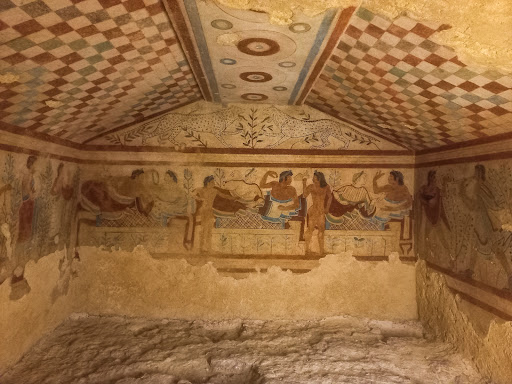 Read moreLa tomba dei leopardi, datata intorno al 470 a.C., è così chiamata per questi animali dipinti nel trapezio antistante l'ingresso. La pianta della tomba è rettangolare con tetto a doppio spiovente. Il simposio raffigurato vede tre coppie di commensali a cui i servitori portano il cibo. Il soffitto è decorato da una scacchiera bianca, rossa e verde, che risultano essere i colori prevalenti. Gli affreschi risultano qui ben...