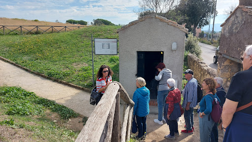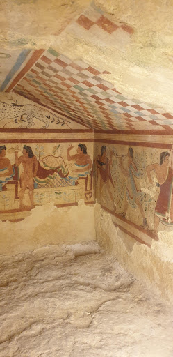 ENGLISH: A short corridor with steps leads down to the rectangular burial chamber with a gabled roof. The decoration: ceiling with chessboard on the slopes and concentric circles on the ridge beam. On the pediment of the back wall, on the sides of a small tree, the two leopards who give the tomb its name face each other. On the walls a large frieze with the banquet in honor of the dead: the banqueters, stretched out on the triclinium beds and served by naked servants, are painted on the back wall; towards them proceed – painted on the side walls – other attendants with the pottery for drinks and the dancers and musicians who cheer up the symposium. The modest quality of the paintings, with characters with a rigid and disproportionate build, is however masked by the fresh vivacity of the...