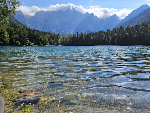 Amazing clear blue lake in the Julian Apls with great views of the mountains and greenery all around. Brilliant view of the Italian side of Mangart. There is an entry charge to visit the lake, it's not much but we didn't know about it. Parking was easy by the side of the road next to the lake. There toilets and cafés around the lake. The views are amazing. You cannot swim in the lake!! We didn't know and there are no signs saying no swimming. We had 2 police officer type people telling us and a few others to get out of the lake, luckily they were really polite and understanding so they informed us about the no swimming rule and said it's ok this time as it was the first time. We just saw 2 other people in the lake swimming so thought it was ok. You can rest a row boat and row on the lake which is a good option. The rowing boats were pretty but made of metal which didn't feel right so we didn't do that. Good for a stop over if you...