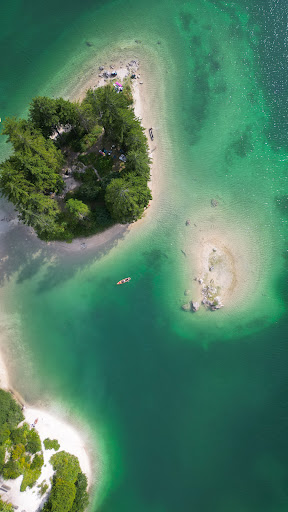 Aerial drone view in middle of the day accentuates the beatifull colors of the lake. The beaches and parking lots were busy this weekend (Agust 2025). It's still...