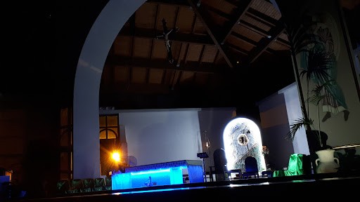 Read moreUna grande piazza con annesso anfiteatro, verde rado ma ben tenuto è costeggiando da un lungo viale alberato, da cui si giunge alla chiesa Stella Maris....si innalza su un sagrato molto grande che gira intorno. La chiesa in stile minimale presenta un fascino singolare dato dai muri bianchi, il tetto in legno che donano un'atmosfera sobria, serena ed avvolgente, chiesa/casa con la sola presenza di DIO. credo mi abbia suggestionato...