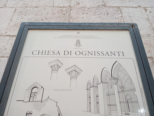 Situata nella parte più storica della città, la Chiesa d'Ognissanti, è conosciuta anche come Chiesa dei Cavalieri Templari,e costituisce un magnifico esempio di architettura romanica pugliese. La sua costruzione risale ai primi decenni del XII secolo. Il Tempio, appartenne ai Templari sino al 1312. Dal 1378 in poi, la Chiesa d" Ognissanti, divenne Cappella gentilizia, nonché luogo di culto, esclusivamente per le famiglie più nobili della città, i cui stemmi sono visibili ancora oggi, esposti in alto dall'ingresso nella Sacrestia. La Chiesa, antistante l'intera facciata, consta di un largo Portico protetto da una cancellata in ferro battuto scuro, il quale, la collegava all'antico ospedale dei Cavalieri Templari. Ma, nel corso degli anni, Essa,ha subito numerose trasformazioni e ampliamenti, come l'innalzamento della Navata centrale e delle Absidi; la realizzazione del magnifico Portale, e la copertura delle Navate laterali con volte a crociera. Questa Chiesa, ha tre Portali, e il Portale maggiore, è compreso tra due colonne con capitelli riccamente scolpiti a ghirlanda, e nella cui lunetta é rappresentata l'Annunciazione. L'interno, completamente in pietra grezza, è a tre Navate divise da sei colonne di granito, sormontate, anch'esse, da capitelli di richiamo, molto lavorati e ben rifiniti. Nella Navata destra, un Crocifisso ligneo di enorme rilievo, primeggia sull'intero luogo sacro. Prospiciente il Porto, si contraddistingue la pregevole parte absidale con lo svettante Campanile sul mare, visibile già da lontano. La Chiesa d'Ognissanti, nonostante il suo valore storico, è di una bellezza rara, e di una semplicità unica veramente, e che conserva ancora oggi, quel fascino d"altri tempi, intramontabile in suddetti luoghi, e che vadano visitati, e interiorizzati,proprio per serbarne la...