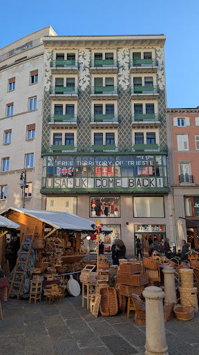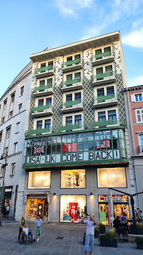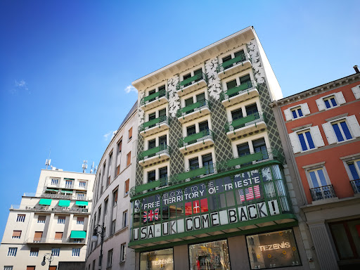 Designed by Max Fabiani between 1905 and 1906, this building is considered one of the most elegant examples of Art Nouveau architecture in Trieste. Influenced by the Vienna Secession, it features a distinctive green-and-white diamond pattern, decorative plant motifs, and curving balconies. Notably, it is one of the few buildings in Trieste constructed using reinforced concrete. Originally intended for both residential and commercial use, the ground floor once housed Restaurant Goldberger, a kosher restaurant rooted in Jewish-Hungarian tradition. Today, the building serves as the headquarters of the Free Trieste Movement, with a banner on the veranda reading: 'Welcome to the Free Territory of Trieste, U.S.A. and...