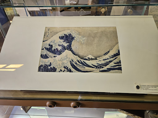 SECONDO PIANO Eâ la parte dedicata al Giappone. Le pareti degli ambienti di questo settore sono tinte di blu, chiaro riferimento ad uno dei simboli del Museo: âLa grande onda presso la costa di Kanagawaâ, xilografia policroma del pittore ed incisore giapponese Katsushika Hokusai, maestro dello stile ukiyo-e (Mondo Fluttuante). In questa sezione trovano posto preziosi manufatti in avorio, lacca, metallo, stampe, maschere e strumenti musicali; questi ultimi due sono un evidente riferimento alla rappresentazione teatrale tipo Kabuki.