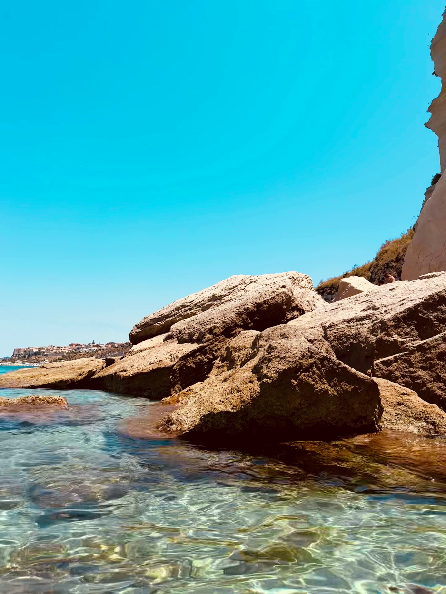 Acqua pulita, trasparenze a non finire, scogli piatti e sulla sinistra la possibilità di raggiungere anche la grotta dello Scheletro (ecco il perché del pin "La via dello Scheletro"). Una spiaggia che per la sua natura selvaggia e le difficoltà di accesso è apprezzabile in ogni momento. Fa dimenticare le folle oceaniche delle spiagge di Tropea centro in alta e...