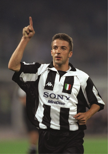 Alessandro del Piero in 1997 in Juventus’ famous black and white stripes. Serie A Scudetto winners are permitted to use the tricolore or ‘little shield’ as a club crest to mark the previous season’s...