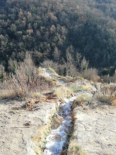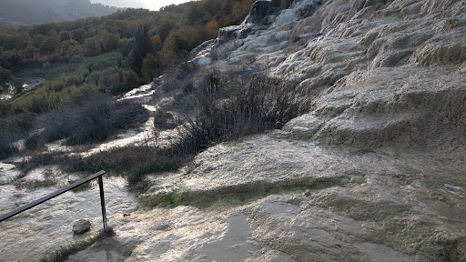 As you come up the hill to the terme the road starts to bear slightly to the left, take the left turn down a stoney road. If you start to see parking on the left under the trees (60 min max stay) or the tarmac carpark you have gone too far ( this is where you pay for the spa hotel /wellness centre/ village). Find a parking place down the lane about 500m down and you will see paths with and without rusy railings to the right. The first pool you get to is the cloudy sulphur clay pool with the water cascading in. The pool does not smell ..only if you grab a handful of clay from the bottom do you get a whiff of sulphur. You must sit under the warm shower. THE SURFACE ALL AROUND THE POOL AND ABOVE THE POOL IS NOT SLIPPERY AS YOU MAY THINK ITS ALL ROCK UNDER FOOT SO YOU CAN EXPLORE THE AREA ABOVE THE POOL SAFETLY - JUST FOLLOW THE WATER UP. We walked up the rocks following the channel of the water to reach the highest point where there is a powerfull water cascade and small pool to sit in. The 1* rating of how dangerous the place i read was IMO was because they tried to get to the pool from the village over the rails and it does look dangerous and slippery to get down from there.