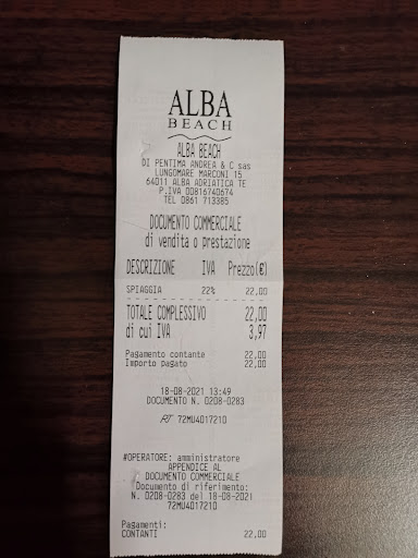 Read moreGrossa delusione! Sono stata con la mia famiglia una settimana in vacanza ad Alba Adriatica. L'hotel aveva per i clienti la convenzione con questo stabilimento. All'arrivo, all'addetto alla spiaggia , Cristian se non erro, abbiamo chiesto di poter cambiare le 2 sdraio ,che erano comprese nel pacchetto, con 2 lettini lasciandoci una sdraio. Mi ha risposto che per poterne usufruire dovevamo aggiungere un euro al giorno. Ok passiamo oltre. Ci accompagna all'ombrellone che si trovava a ridosso del bar, alchè ho chiesto se ne potevamo avere uno un po' più verso il mare ,dato che ce n'erano di chiusi e quindi liberi ma ha risposto che erano tutti occupati. A malincuore ci siamo accontentati promettendoci che forse il giorno dopo ci avrebbe spostato. Ma il bello è stato il pomeriggio dalle 16,30 in poi. Completamente all'ombra!!!!! I gazebo del bar coprivano del tutto il sole per l'intero pomeriggio ! Sono tornata di nuovo a chiedere di spostarci ma niente da fare e il giorno dopo ci è andato pure mio marito ma senza successo. Allora abbiamo deciso di lasciar perdere, tanto x fortuna una settimana passa presto.Evidentemente i nostri soldi nn erano come quelli degli altri clienti! Che delusione!...