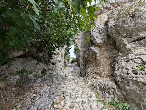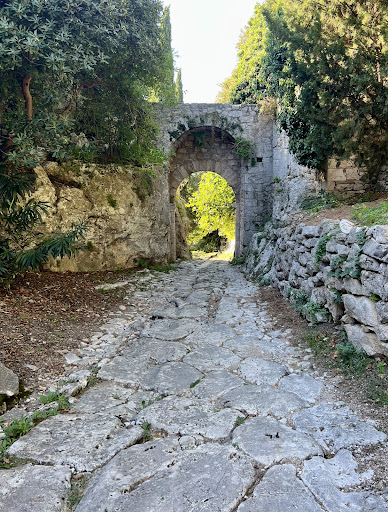 The paved road you walk on faithfully follows the ancient Roman path, with clear remnants of large slabs and sidewalk blocks.