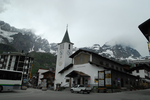 Desde muy joven siempre había soñado con ver mas o menos de cerca el Monte Cervino y este día iba a ver cumplido mi deseo. Breuil Cervinia más que un pueblo es en realidad una estación de esquí, montañismo y de escaladores. Todo esta basado en estas actividades. Gran cantidad de hoteles, apartamento, restaurantes, puntos de remontes y pequeñas tiendas acaparan el espacio. Como una excepción nos encontramos con la moderna iglesia de Santa María Reina de Valle de Aosta cuya edificación se empezó a construir en 1955, terminándose con el campanario en 1957. Desde luego mis expectativas se vieron cumplidas ampliamente, enfrente a nosotros se encontraba quizás la reina de las montañas de los Alpes con forma una auténtica pirámide, por cuyos lados se han tenido que lamentar numerosos accidentes con victimas mortales. Lo que no hay que fiarse es de la climatología. Aunque sea un día espléndido y casi sin nubes, te puedes encontrar que al final no tengas la suerte de ver la cima del Cervino. La aglomeración de nubes alrededor de su cima a 4.478 metros de altitud, es impredecible y pueden pasar...