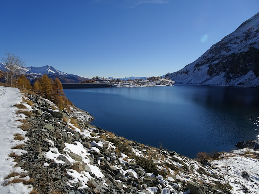 Bacino artificiale raggiungibile lasciando la macchina nella località Barmasse (svoltare a sinistra prima di entrare nel paese di Valtournenche). Ci sono alcuni parcheggi ai lati della Cappella Valmartin, da qui si seguono i cartelli, il sentiero non è numerato per la prima parte ma si incrocia poi il numero 6. Si arriva prima alla stazione a monte della centrale idroelettrica e si prosegue per la diga. In totale sono poco più di 4 km di salita con 650 metri di dislivello. Una volta arrivati è possibile salire ancora fino alla finestra di Cignana per godere di un'ottima vista sulla valle del Cervino. Consiglio di andarci in autunno, come si vede dalle foto è un luogo suggestivo e...